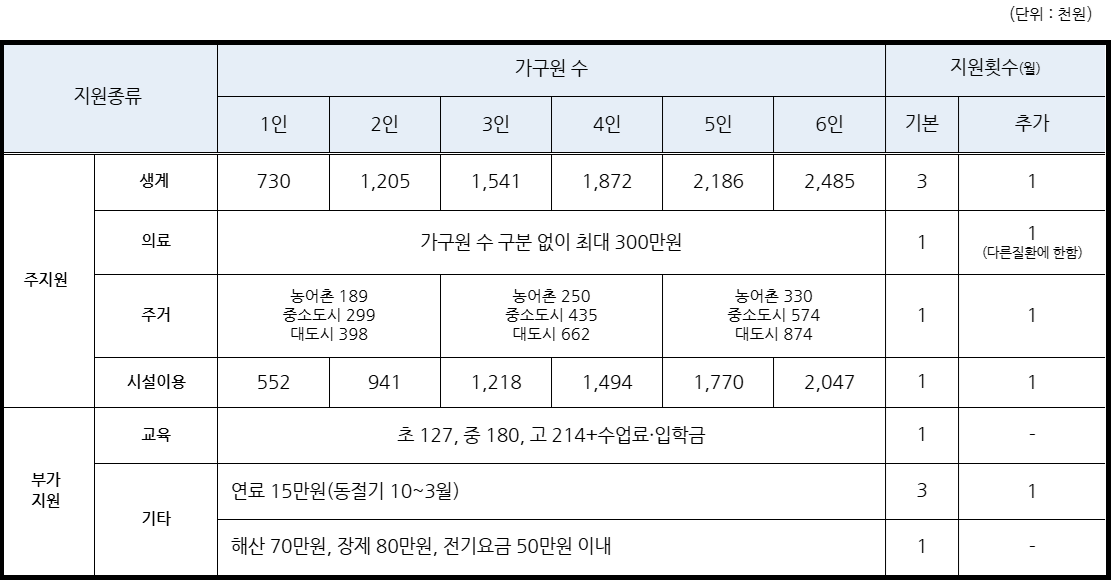 | 구분 | 1인가구 | 2인가구 | 3인가구 | 4인가구 | 5인가구 | 6인가구 |