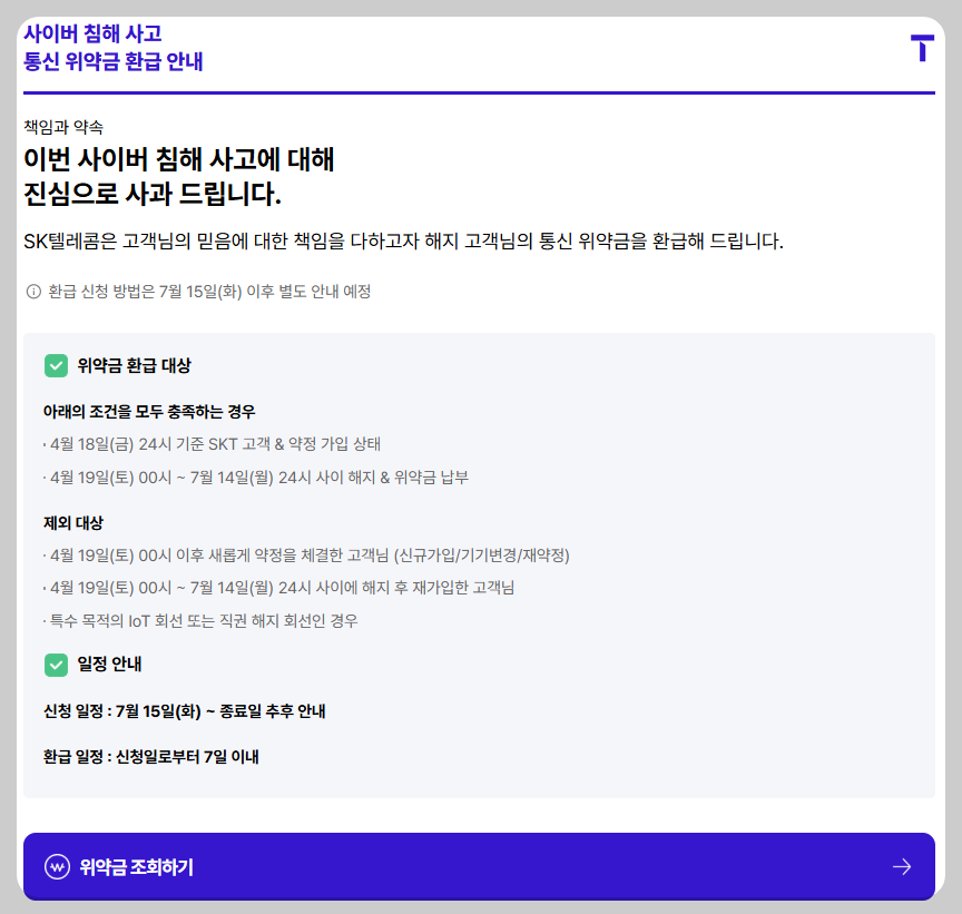 하지만 이번 SKT의 보상안으로 특정 조건을 만족하면 이 위약금이 전액 면제되며, 이미 납부한 경우에는 환급도 가능합니다.